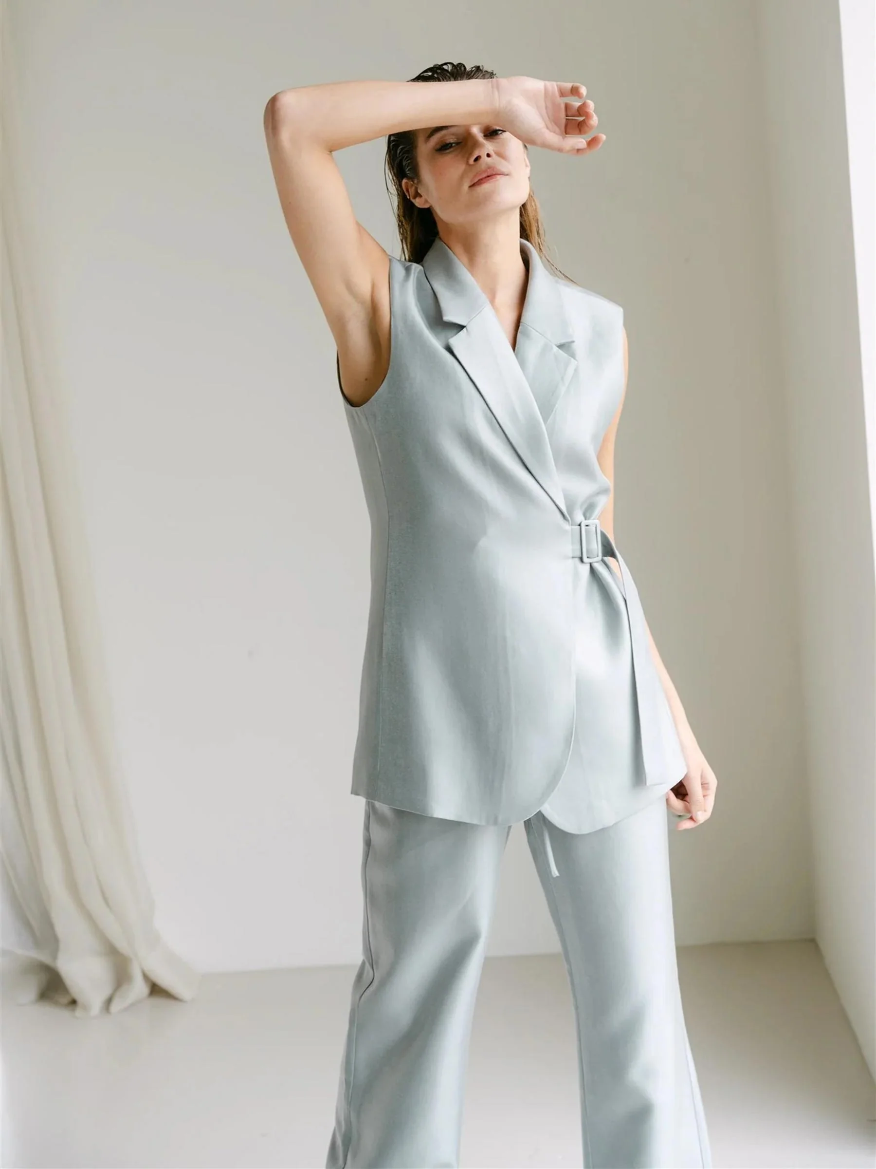 Dit lichtblauwe gilet HopeAA van Aímée the Label geeft je outfit meteen een sterke uitstraling. De zachte glans en het strikdetail in de taille zorgen voor een mooi silhouet dat je zelf kunt aanpassen.