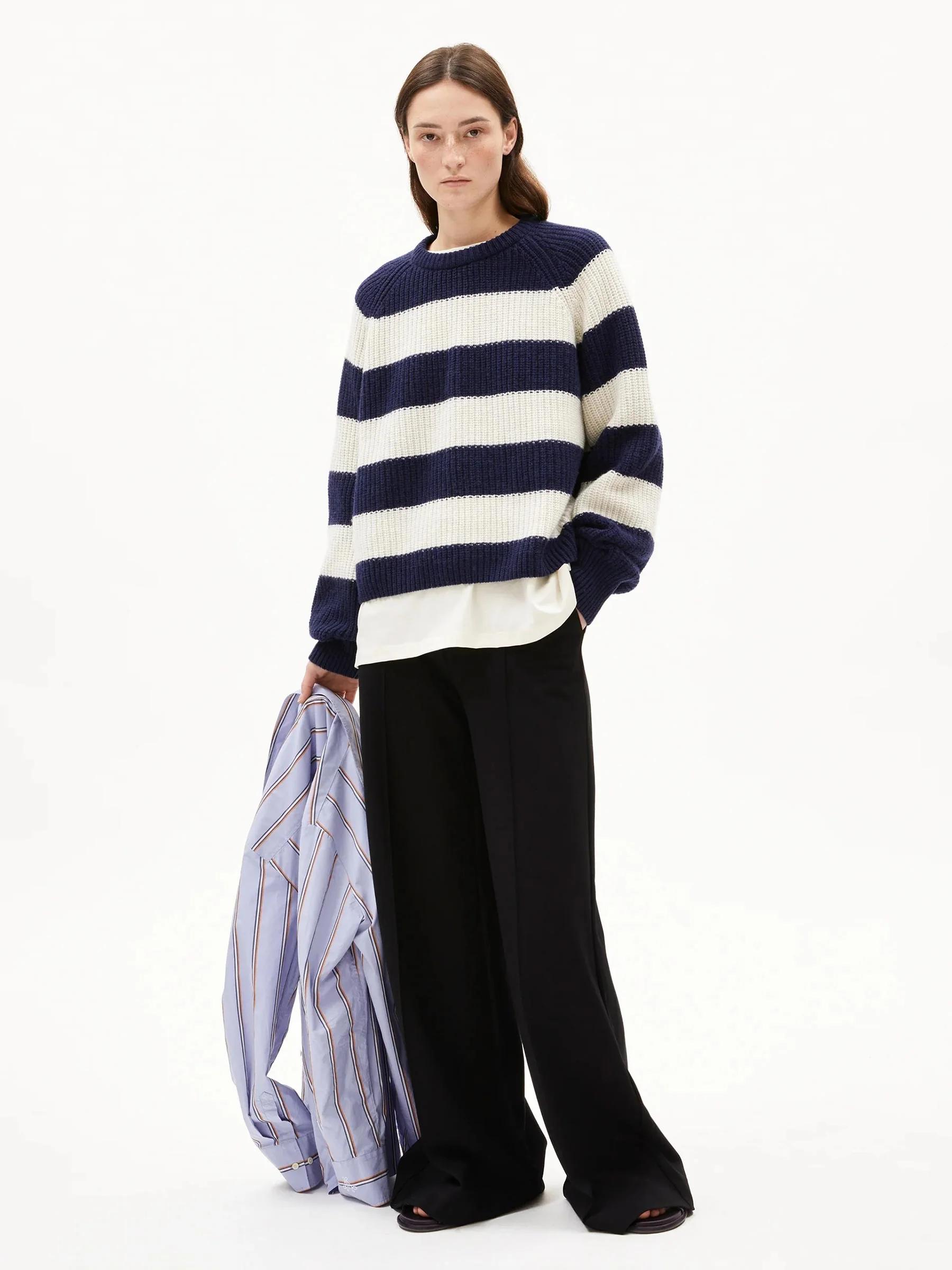 Deze navy gestreepte trui van Armedangels brengt een speelse knipoog naar de klassieke marinelook. Het grofgebreide materiaal en de relaxte pasvorm maken hem heerlijk comfy, terwijl de brede strepen zorgen voor een frisse uitstraling. Perfect te combineren met jeans of een zwarte pantalon voor een casual maar stijlvolle look.