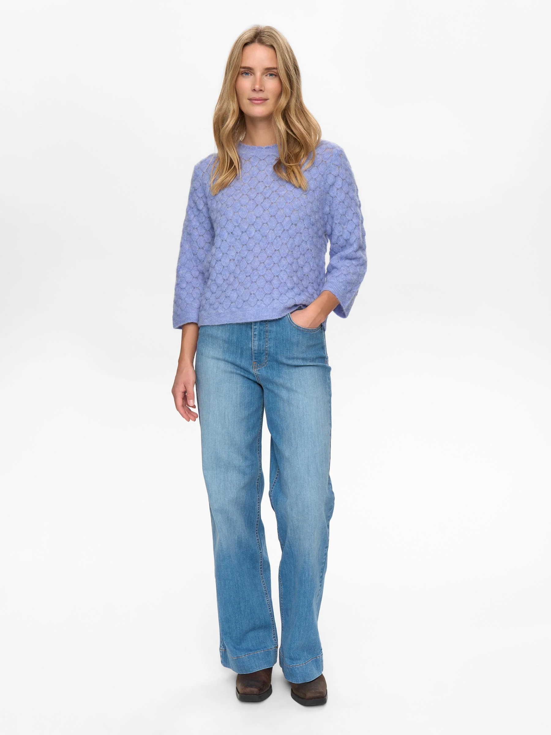 Dit blauwe truitje van Nümph is perfect voor dagen waarop je iets zachts en bijzonders wilt dragen. De fijne structuur geeft de trui een mooie uitstraling en voelt licht en comfortabel aan. Draag met denim of een pantalon en je look staat meteen goed.