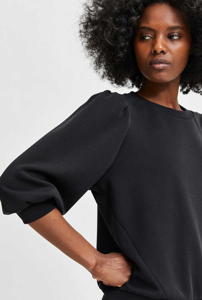 Comfort met een twist: deze zwarte sweater van Selected Femme combineert het relaxte gevoel van een sweatshirt met vrouwelijke pofmouwen voor net wat extra flair. Gemaakt van een zachte katoenmix die heerlijk draagt, maar toch een verfijnde look heeft.